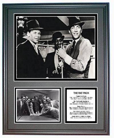 The large mat opening contains a high quality 8" x 10" photo of the infamous Rat Pack. The bottom right opening has biographical information about each member and the bottom left opening has a small photo of the gang. Mat colors may vary slightly depending on availability.