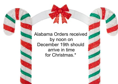 * Please note: Orders outside Alabama may require expedited shipping to arrive by Christmas. UPS and The Postal Service do not guarantee delivery during the Christmas holidays. However our experience with both carriers has been very good the past few years. Most Alabama deliveries are made the next day so we feel comfortable saying that orders received by the above date will make it in time for Christmas. Thank you and Merry Christmas! |