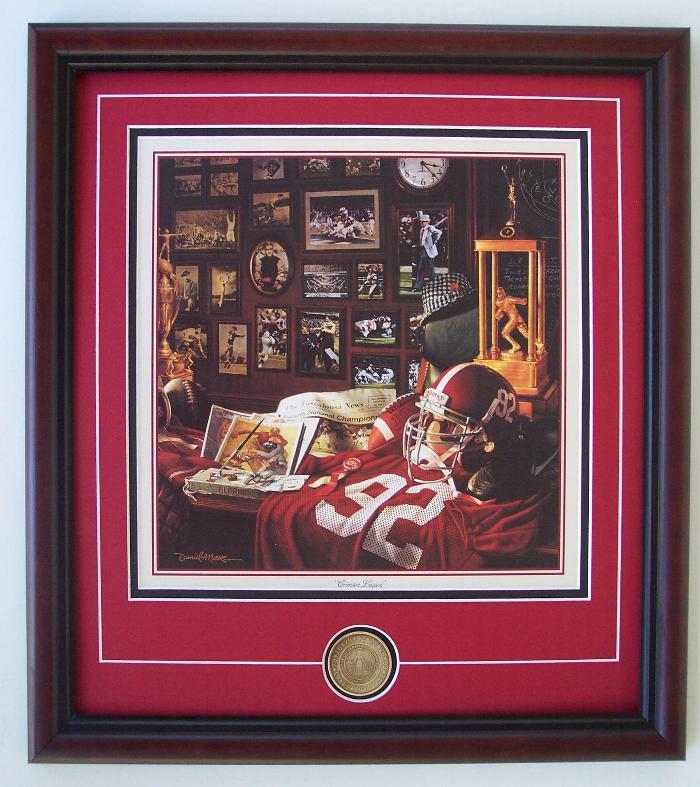 This Daniel A. Moore painting commemorates the 1992 Centennial of Football. In Coach Bryant's "office", great players and coaches of the past are accompanied by other elements, telling the story of the "Crimson Legacy"